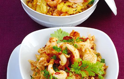 Roter Calamari-Reis Zutaten 500 g küchenfertige Tintenfische 1 Zwiebel 1 rote Chilischote 4 Frühlingszwiebeln 3 EL Öl 1 EL rote Currypaste 750 g kalter, gekochter Reis (aus 300 g Reis) 1-2 EL Fischsauce 1 EL helle Sojasauce 1/2 Bund Koriandergrün (ersatzweise Petersilie) [...]