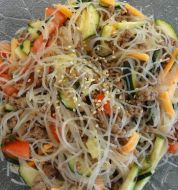 Glasnudelsalat mit Zitronenhack Zutaten 150 g Glasnudeln 2 Möhren (etwa 150 g) 2 zarte Stangen Staudensellerie (etwa 100 g) 1 dünne Stange Lauch 1 rote Chilischote 1 Bio-Zitrone 4 EL Öl 250 g gemischtes Hackfleisch oder Rinderhack 2 EL helle Sojasauce 4 EL Fischsauce 1 TL Z [...]