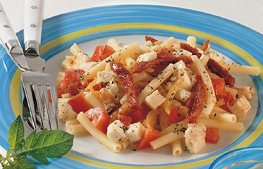 Nudelsalat mit Speck und Tomaten Zutaten 250 g Mozzarella 2 Knoblauchzehen 1 TL getrockneter Thymian Salz Pfeffer Chilipulver 4 EL Olivenöl 150 g durchwachsener Speck 1 große Zwiebel 300 g feste Tomaten 4 getrocknete, in Öl eingelegte Tomaten 250 g dünne Makkaroni 3 EL [...]