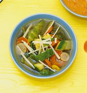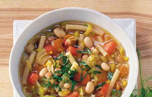 Minestrone Zutaten 1 kleine Zwiebel 100 g durchwachsener Räucherspeck 1 Stange Staudensellerie 1 kleine Stange Lauch 2 große Möhren 3 Frühlingszwiebeln 100 g gegarte weiße Bohnen (aus der Dose) 3 EL Olivenöl 1 EL Tomatenmark 1 1/2 l heiße Rinderbrühe (Instant) 100 g Makka [...]