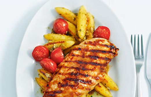 Hähnchenschnitzel mit Pesto-Schupfnudeln Zutaten 3 EL Olivenöl 600 g Schupfnudeln (aus dem Kühlregal) 4 Hähnchenschnitzel (à ca. 140 g) Salz Pfeffer aus der Mühle 2 EL Tomatenmark 100 g Kirschtomaten 1/8 l Hühnerbrühe 2-3 EL Basilikumpesto (aus dem Glas) guk:similarity-key [...]