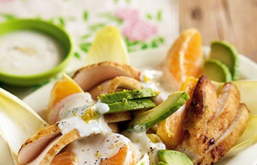 Hähnchen-Avocado-Salat Zutaten 4 Hähnchenbrustfilets (à 150 g) Salz Pfeffer 2 TL edelsüßes Paprikapulver 3 EL Öl 300 g Naturjoghurt Saft und abgeriebene Schale von 1 Bio-Zitrone 1/2 TL Zucker 4 Stauden Chicorée 2 reife Avocados (à ca. 200 g) 4 Clementinen guk:similarity [...]