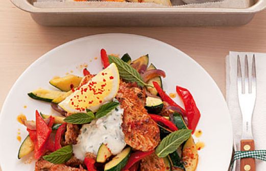 Gemüse-Gyros mit Pute Zutaten 250 g Putenbrust 1-2 EL Gyrosgewürz 2 EL Olivenöl 75 g rote Zwiebeln 200 g Zucchini 1 rote Paprikaschoe 1 Knoblauchzehe 2 Stängel Minze 150 g Joghurt (1,5 % Fett) 2 TL Zitronensaft Salz schwarzer Pfeffer 1 Prise Zucker Paprikapulver (rose [...]