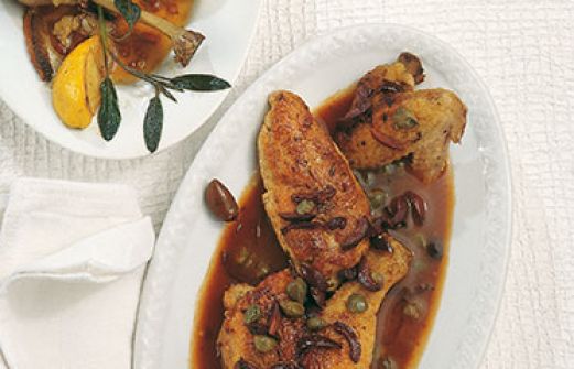 Hähnchen mit Oliven und Kapern Zutaten 1 küchenfertiges Hähnchen (1,2 kg) 2 Knoblauchzehen 1 TL Rosmarinnadeln 8 weiße Pfefferkörner 6 EL Olivenöl abgeriebene Schale und Saft von 1 unbehandelten Zitrone 2 EL Tomatenmark ⅛ l Weißwein (ersatzweise Hühnerbrühe) 2 eingelegte Sarde [...]