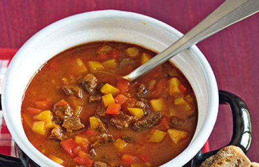 Gulaschsuppe mit Paprika Zutaten 500 g Rinderschulter 2 große Zwiebeln 4 EL Öl Salz Pfeffer 2 EL Tomatenmark je 1 EL edelsüßes und rosenscharfes Paprikapulver 1 1/4 l Fleischbrühe 300 ml Tomatensaft je 2 rote und gelbe Paprikaschoten 500 g Kartoffeln guk:similarity-keyw [...]
