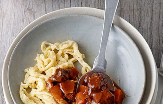 Rehragout mit Spätzle Zutaten 400 g Zwiebeln 2 Möhren 1/4 Sellerieknolle 1/2 Stange Lauch 4 Knoblauchzehen 1 EL schwarze Pfefferkörner 6 Wacholderbeeren 2 Gewürznelken 1,2 kg Rehfleisch (aus der Schulter oder Keule) 1 Lorbeerblatt 100 ml Rotweinessig 3/4 l Rotwein 3 EL [...]