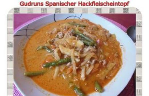 Zutaten für Personen Rezept mit Bild: Eintopf: Spanischer Hackfleischeintopf Bild einstellen 250 gr. Schweinehackfleisch 100 Gr. Grüne Bohnen 100 Gr. Kartoffeln, geschält und in Streifen geschnit [...]