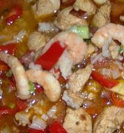 zutaten_2sp"> Zutaten für Personen Bild einstellen 200 g Hühnerbrust 250 g gekochte Garnelen 2 Stück Zwiebeln 1 Stück Knoblauchzehe 1 Stück rote Paprika 1 Stück Stangensellerie 1 Spritzer Tabasco 1 Prise gem. Muska [...]