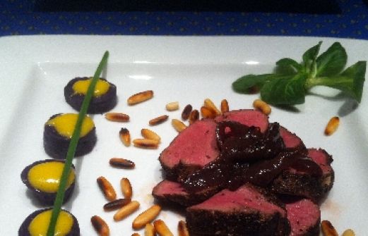 Rehrücken mit Tropea-Zwiebeln und Pinienkernen Zutaten 250 g Rehrückenfilet 1 El Olivenöl 1 El Wildgewürz -------- 1 El Tropea-Zwiebeln in Rotwein (Cipolla rossa di Tropea al vino rosso) 1 El Preiselbeeren (aus dem Glas) 3 El Pinienkerne -------- 12 blaue Kartoffeln der Sorte Vite [...]