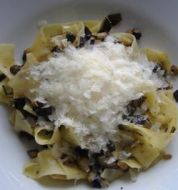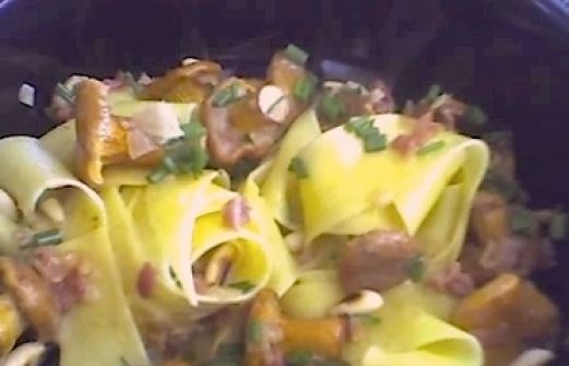 Pappardelle mit Pfifferlingen Zutaten 160 g Pappardelle (breite Nudeln) 300 g kleine Pfifferlinge 150 ml Pfifferlingsfond (aus dem Glas) 1 kleine Schalotte 50 ml Weisswein 50 g Parmaschinken in feinen Streifen 1 El Butter 50 ml Sahne 30 g Parmigiano 1 Bund Schnittlauch 20 g Pi [...]