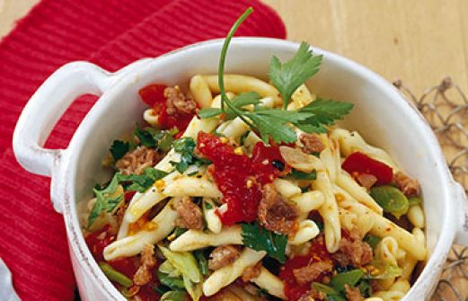 Tomatensauce mit Sardellen Zutaten 4 Knoblauchzehen 4 Frühlingszwiebeln 1 Bund Petersilie 2 getrocknete Chilischoten 12 in Öl eingelegte Sardellenfilets 4 EL Olivenöl 1 große Dose geschälte Tomaten (800 g Inhalt) Salz 1 Prise Zucker 500 g Penne, Casarecce, Rigatoni oder Fus [...]