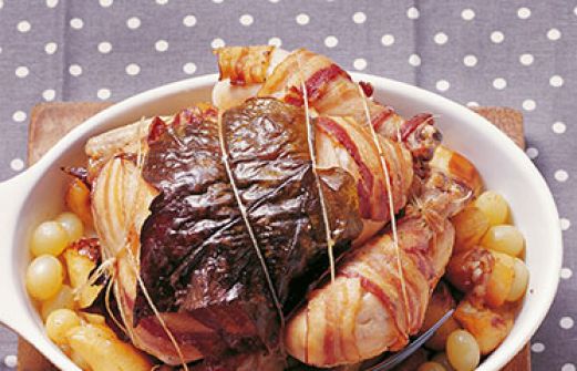 Brathähnchen in Blättern Zutaten 1 großes Hähnchen, möglichst ein Bauernhähnchen aus Freilandhaltung (1,4 kg) ¼ l Weißwein (ersatzweise Fleischbrühe) Salz 1 Lorbeerblatt 3 Wacholderbeeren 1 Gewürznelke 2 EL weiche Butter 2 dünne Scheiben gut durchwachsener Speck (Dörrfleisch, ersa [...]