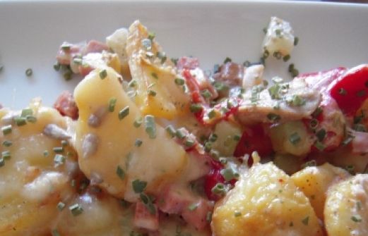 Cremiges Schinkengröstl Zutaten 2 große Kartoffeln 2 Scheiben Kohlrabi 2 Frühlingszwiebeln 1/2 roter Paprika einige Champignons, auch aus dem Glas möglich 3 EL Sauerrahm Salz, Pfeffer je 1 TL Petersilie, Liebstöckl 50 g geriebener Käse, zb Emmentaler 2 EL Öl 1 Scheibe Schink [...]