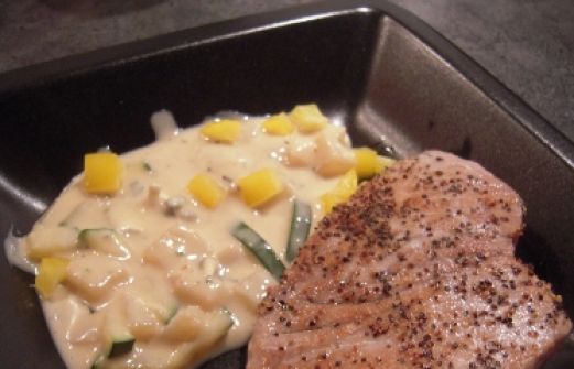Tunfischsteak in Birnen-Käsesauce Zutaten 1/2 Zucchini 1 Birne 150 g Creme fraîche 150 ml Brühe 1 EL weißer Balsamico 100 g Blauschimmelkäse Salz Zitronenpfeffer 2 Stk. superfrische Tunfischsteaks 1/2 gelber Paprika 2 EL Öl Basilikum guk:similarity-keywords=""> 1/2 [...]