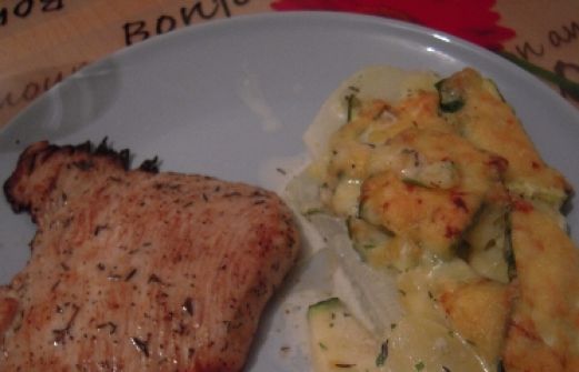 Putenschnitzel an Kohlrabi- Gemüsegratin Zutaten 2 Stk. Putenschnitzel 1 EL Öl Salz, Pfeffer 1 Schuss Worcestersauce 1 TL Thymian 1 Kohlrabi 1 Schuss Apfelessig 3 mittlere Kartoffeln, festkochend 1/2 Zucchini 50 ml Schlagobers 50 ml Milch 100 g geriebener Käse guk:simil [...]