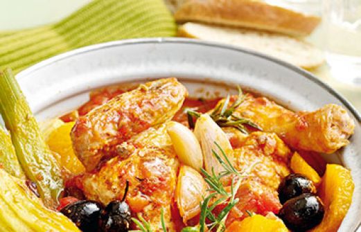 Huhn mit Fenchel und Oliven Zutaten 1 Poularde (ca. 1,8 kg; vom Metzger in 8 Teile schneiden lassen) Salz Pfeffer 3 Fenchelknollen 250 g Schalotten 2 Knoblauchzehen 1 TL Fenchelsamen 2 Orangen 2 Stängel Rosmarin 1/2 Bund Thymian 100 ml Pernod (Anis-Aperitif-Likör;) 2 Do [...]
