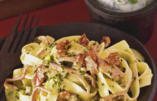 Bandnudeln in Pestosahne Zutaten 400 g Bandnudeln Salz Pfeffer 1 Bund Frühlingszwiebeln 50 g Walnusskerne 1 EL Öl 1 TL Mehl 200 g warme Fleischbrühe 100 g Sahne 4 EL grünes Pesto (Glas) 100 g gekochter Schinken in Scheiben guk:similarity-keywords=""> 400 g Bandnudel [...]