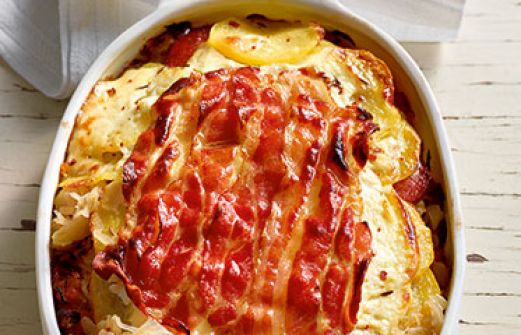 Sauerkrautauflauf mit Kassler Zutaten 1 kg festkochene Kartoffeln Salz 2 Zwiebeln 1 TL Kümmelsamen 2 EL Schweineschmalz 750 g Sauerkraut (frisch oder aus der Dose) 1/2 TL Chilipulver 1-2 TL Zucker 300 g gegartes Kassler (ohne Knochen) 2 Kabanossi (je ca 250 g) Pfeffer 200 [...]