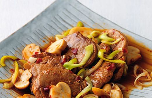 Filet mit Lauch und Pilzen Zutaten 250 g Filet vom Schwein (oder Pute, Hähnchenbrust bzw. Rind) Salz Pfeffer 2 EL Öl 100 g Lauch 100 g Egerlinge oder Champignons 150 ml Gemüsebrühe 3 EL Sojasauce 1 EL Limettensaft 2 EL trockener Sherry (ersatzweise Orangensaft) Sambal Oele [...]