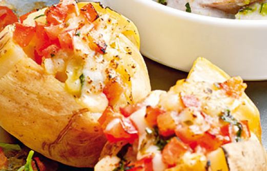 Ofenkartoffeln mit Pizza-Füllung Zutaten 4 mehligkochende Kartoffeln (à ca. 250 g) 1 Fleischtomate 2 Stängel Basilikum 1 Knoblauchzehe 2 EL Olivenöl 1/2 TL getrockneter Oregano 250 g Mozzarella Salz Pfeffer guk:similarity-keywords=""> 4 mehligkochende Kartoffeln (à [...]