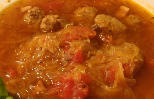 Sauerkrautsuppe Zutaten 500 g Sauerkraut 250 g Zwiebeln 100 g durchwachsener geräucherter Speck 1 grosse Dose Tomaten geschält 8 EL Öl 8 Stck. ungebrühte frische Bratwürste 3 l klare Fleischbrühe 1 TL Kümmel Pfeffer a.d.Mühle 2 TL Paprikapulver edelsüss Chilipulver nach Geschm [...]