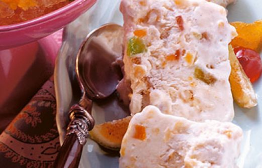 Nougat glacé Zutaten 150 g gemischte kandierte Früchte (z. B. Melonen und Aprikosen) 4 EL Orangenlikör (z. B. Grand Marnier) 100 g gehäutete Mandeln 80 g feiner Zucker 4 sehr frische Eiweiße 80 g Honig 250 g Crème fraîche 150 g Sahne je 1 Prise Zimtpulver und gemahlene Vanille [...]