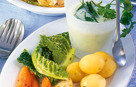 Gebratenes Gemüse mit Sabayon Zutaten 300 g möglichst kleine Kartoffeln 800 gemischtes Gemüse (z.B. Rosenkohl, Brokkoli, Möhren und Wirsing) Salz 100 g Champignons 1 EL Olivenöl 4 Kirschtomaten 1 EL Petersilienblättchen 1 EL gehackte Petersilie Pfeffer 1 Ei (Größe L) 150 [...]