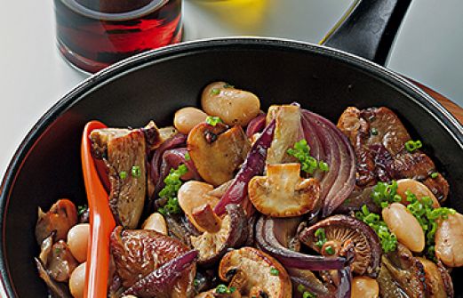 Pilzpfanne mit Bohnen Zutaten 300 g gemischte Pilze (z.B. Champignons und Egerlinge, Shiitake, Austernpilze) 100 g kleine rote Zwiebeln 1 Knoblauchzehe 6-8 Zweige Thymian 2 EL Pflanzenöl 1 EL Butter Salz, schwarzer Pfeffer 1 EL Aceto balsamico (Balsamessig) 1 Dose dicke weiße [...]
