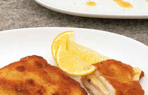 Cordon bleu Zutaten 4 dünne Putenschnitzel (à 125 g) Salz Pfeffer 60 g schnittfester Edelpilzkäse 4 Scheiben Lachsschinken 2 EL Mehl 1 großes Ei (Größe L) 4 EL Semmelbrösel 3 EL Butterschmalz zum Braten 1 Zitrone Rouladennadeln oder Zahnstocher guk:similarity-keywords=" [...]