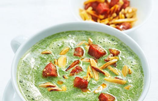 Spinatsuppe mit Mandeln Zutaten 400 g TK-Blattspinat 2 EL Olivenöl 60 g gemahlene Mandeln 2 Knoblauchzehen 3/4 l Gemüsebrühe Salz Pfeffer aus der Mühle 100 g Sahne 100 g Chorizo (am Stück, spanische Knoblauch-Paprika-Wurst; ersatzweise Kaminwurzen oder Landjäger) 4 EL Mande [...]