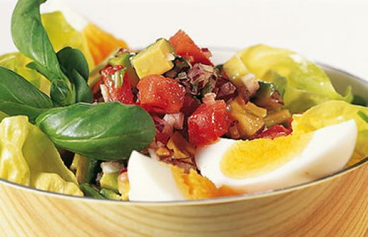 Salat mit Ei und Avocado Zutaten 1 Salatkopf mit zarten Blättern (z.B. Kopf-, Eichblatt- oder Novitasalat) 4 Eier 300 g vollreife Tomaten 1 rote Chilischote 1 rote Zwiebel 2 EL Limettensaft Salz 1/2 TL Zucker 4 EL Olivenöl 2 Avocados ein paar Basilikumblättchen guk:sim [...]