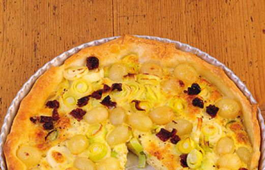 Lauch-Käse-Wähe mit Weintrauben Zutaten 1 Packung Pizzateig (400 g; Kühlregal) 1 EL Mehl 2 Stangen Lauch 30 g getrocknete Tomaten in Öl 150 g grüne kernlose Weintrauben 100 g Sahne 100 g geriebener Emmentaler oder Gruyère 2 Eier Salz Pfeffer 1 EL Öl guk:similarity-k [...]