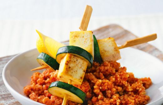 Tomaten-Bulgur mit Tofuspießen Zutaten 300 g fester Tofu 6 EL Olivenöl 1 EL frisch gepresster Zitronensaft Salz Pfeffer 1 Knoblauchzehe 1 Zwiebel 2 TL Tomatenmark 300 g Bulgur 1 Dose stückige Tomaten (400 g) 600 ml Gemüsebrühe 200 g junge Zucchini 8 Schaschlik- oder Ho [...]