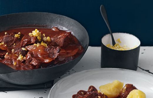 Rindergulasch mit Knoblauch und Zitrone Zutaten 1 kg hintere Rinderwade ohne Knochen 2 Gemüsezwiebeln (ca. 450 g) Salz schwarzer Pfeff er aus der Mühle 1 TL rosenscharfes Paprikapulver 3 TL edelsüßes Paprikapulver 1 EL Mehl 4 EL Pflanzenöl 2 EL Tomatenmark 200 ml kräftiger Rot [...]