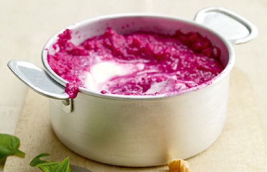 Rote-Bete-Sauce mit Walnüssen Zutaten 250 g vorgegarte Rote Beten (vakuumverpackt) 1/4 l Gemüsebrühe 1/2 Lorbeerblatt 1 Msp. getrockneter Majoran 1 EL Weißweinessig 2 EL Walnusskerne 5 Stängel Basilikum 2 EL Crème légère (15 % Fett) Salz Pfeffer guk:similarity-keywords=""> [...]