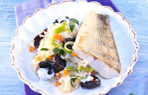 Sahne-Sauerkraut mit Trockenpflaumen und Zander Zutaten 1 Möhre 1 kleine Stange Porree 1 Zwiebel 3 EL Öl 1 Lorbeerblatt 2 Wacholderbeeren 750 g Sauerkraut 200 ml Schlagsahne Salz, Pfeffer 200 g kalifornische Trockenpflaumen 2 EL Feigensenf 600 g Zanderfilet mit Haut 2 EL gehac [...]