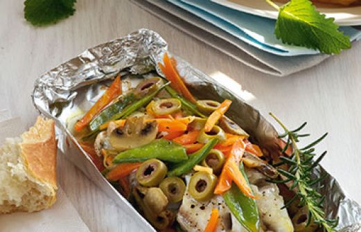 Rotbarsch aus der Folie Zutaten 250 g Möhren 150 g Zuckerschoten 100 g kleine Champignons Salz Pfeffer 100 g entsteinte grüne Oliven 4 Rotbarschfi lets (à ca. 160 g) | 4 EL Zitronensaft 4 sehr kleine Zweige Rosmarin 4 EL Olivenöl + Olivenöl zum Einfetten 4 Stück Alufolie [...]