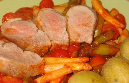 Filet mit Tomaten-Spargel-Ragout Zutaten 300 g Drillinge oder kleine Kartoffeln 300 g Schweinefilet 1 TL Pflanzenöl je 250 g weißer und grüner Spargel 500 g passierte Tomaten (Dose oder TetraPack) 1 EL Balsamico-Essig 300 g Cocktailtomaten 1 Prise Zucker guk:similarity-keywords [...]