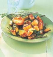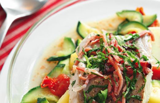 Fischeintopf mit Zucchini und Kartoffeln Zutaten 300 g gekochte Kartoffeln 150 g Kirschtomaten 200 g marinierte Zucchini 1 EL Zucchinisud 300 g Rotbarschfilet (oder anderes festfleischiges Fischfilet) Salz Pfeffer Zucker 4 Stängel Petersilie 40 g roher Schinken 1 EL Butt [...]