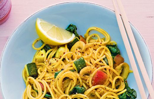 Asia-Spaghetti Zutaten 250 g Spaghetti Salz 2 EL helle Sojasauce 4 TL körniger Senf 1 EL Zitronensaft 2 TL Kurkumapulver 3 TL Zucker 2 Knoblauchzehen 1 Zucchino (ca. 200 g) 200 g Champignons 1 rote Zwiebel 2 EL Öl 1 EL Butter 150 g junger Blattspinat (küchenfertig; ersa [...]