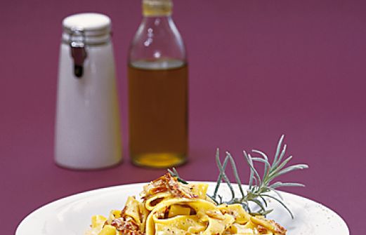 Tagliatelle in Weissweinsauce mit getrockneten Tomaten Zutaten 200 g getrocknete Tomaten in Öl (Glas) 1 Zwiebel 3 EL Pinienkerne 500 ml trockener Weißwein (z. B. Chardonnay) 250 g Sahne 200 g Tagliatelle (Bandnudeln) Salz schwarzer Pfeffer aus der Mühle guk:similarity-keywo [...]