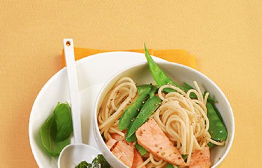 Lachs-Spaghetti mit Pesto Zutaten Salz 250 g Zuckerschoten 400 g Spaghetti 1 EL Pinienkerne 1 Bund Basilikum (ca. 40 g) 1 Knoblauchzehe 50 ml + 2 EL Olivenöl 30 g geriebener Parmesan Pfeffer 500 g Lachsfilet (ohne Haut) 1 EL Zitronensaft guk:similarity-keywords=""> [...]
