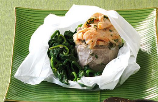Schweinelende mit Lachs auf Südsee-Art Zutaten 150 g junger Blattspinat Salz 2 TL Sonnenblumenöl 2 Scheiben Schweinelende (à 125 g, ohne Fettrand) weißer Pfeffer 4 Scheiben Graved Lachs 2 EL blanchierte Mandeln 150 ml Kokosmilch 1 Stück frischer Ingwer (ca. 1 cm) Backpapie [...]