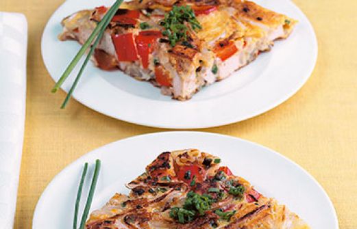 Tofu-Paprika-Omelett Zutaten 1-2 Knoblauchzehen 1 große Zwiebel 200 g geräucherter Tofu (Reformhaus, Bioladen) 1 TL edelsüßes Paprikapulver Salz Pfeffer 3 TL Olivenöl 1 rote Paprikaschote 1/2 Bund Schnittlauch 100 g Mungobohnensprossen 4 Eier guk:similarity-keywords=" [...]