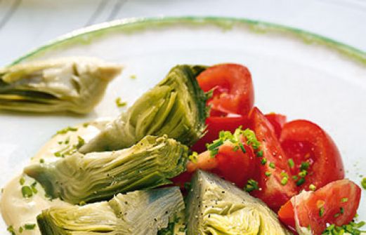 Junge Artischocken mit Tomaten und Knoblauch-Schnittlauch-Mayonnaise Zutaten frisch gepresster Saft von 1 Zitrone 8 Mini-Artischocken (Sorte »Spinoso sardo Salz 1 Knoblauchzehe 1 Bund Schnittlauch 1 zimmerwarmes Ei (Größe M) 100 ml Olivenöl 1 Msp. Senf Pfeffer aus der Mühle [...]