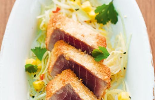 Pfeffer-Thunfisch auf Glasnudel-Krautsalat Zutaten 1/2 kleiner Spitz- oder Weißkohl 3 EL Sonnenblumenöl 2 EL Sesamöl 2-3 EL Reisessig Salz Pfeffer Zucker 100 g Glasnudeln 1 kleine Baby-Ananas 1 EL Sweet-Chili-Sauce 1-2 EL Sojasauce 1-2 Stängel Koriandergrün 2 EL Sichuanpfe [...]