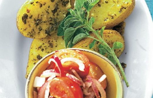 Oregano-Kartoffeln mit Tomaten Zutaten 1,5 kg mittelgroße neue Kartoffeln 1 Bund Oregano oder Majoran 150 g Pecorino- oder Parmesankäse Salz schwarzer Pfeffer (aus der Mühle) 750 g Tomaten 1 rote Zwiebel 3 EL Sherry-Essig 1 TL Senf 5 EL Olivenöl guk:similarity-keywords=" [...]