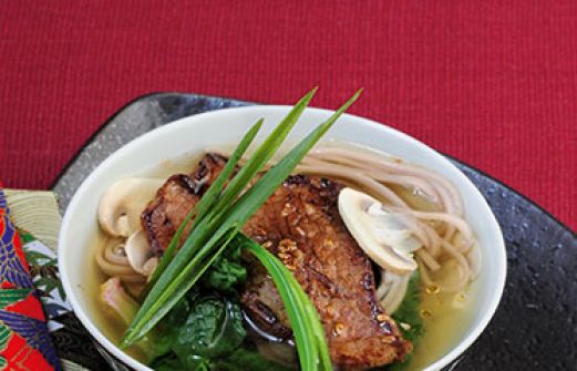 Rindfleischsuppe mit Soba-Nudeln Zutaten 100 g Rinderfilet 1 Knoblauchzehe 3 EL Sojasauce 1 EL geröstetes Sesamöl 1 EL Sesamsamen 1/2 TL Zucker 60 g Soba-Nudeln Salz 100 g Wurzelspinat 4 Champignons 2 Frühlingszwiebeln 400 ml Rinderbrühe 2 EL Mirin 1 EL Sonnenblumenöl [...]