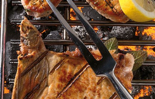 Schweinekoteletts mit Salbei Zutaten 4 dicke Schweinekoteletts (à 200 g) 8 frische Salbeiblätter 1 Zwiebel 2 Knoblauchzehen 2 Zweige Thymian 2 Gewürznelken 1 Lorbeerblatt 200 ml trockener Weißwein 2 EL Olivenöl Salz Pfeffer Öl für den Rost und zum Bestreichen guk:sim [...]