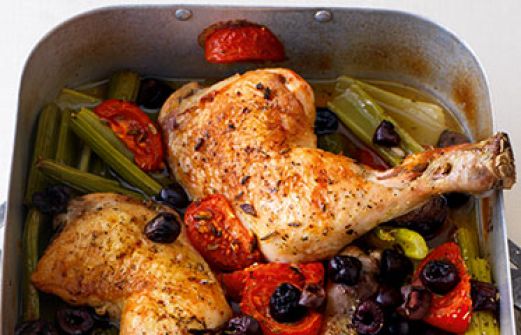 Hähnchenschenkel mit Tomaten und Oliven aus dem Ofen Zutaten 400 g Staudensellerie 2 Knoblauchzehen 3 rote Zwiebeln 5 aromatische Tomaten 50 g entsteinte schwarze Oliven 2 Hähnchenkeulen Salz schwarzer Pfeffer 3 TL Olivenöl 300 ml Hühnerfond (aus dem Glas) 1/2 TL Fenchelsa [...]